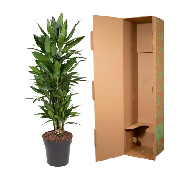 De Dracaena Janet Lind vertakt van 110 cm is een compacte, stijlvolle kamerplant met twee volle bladkronen en glanzend donkergroen blad. Een sterke blikvanger voor kleinere ruimtes of als subtiele aanvulling in grotere interieurs.