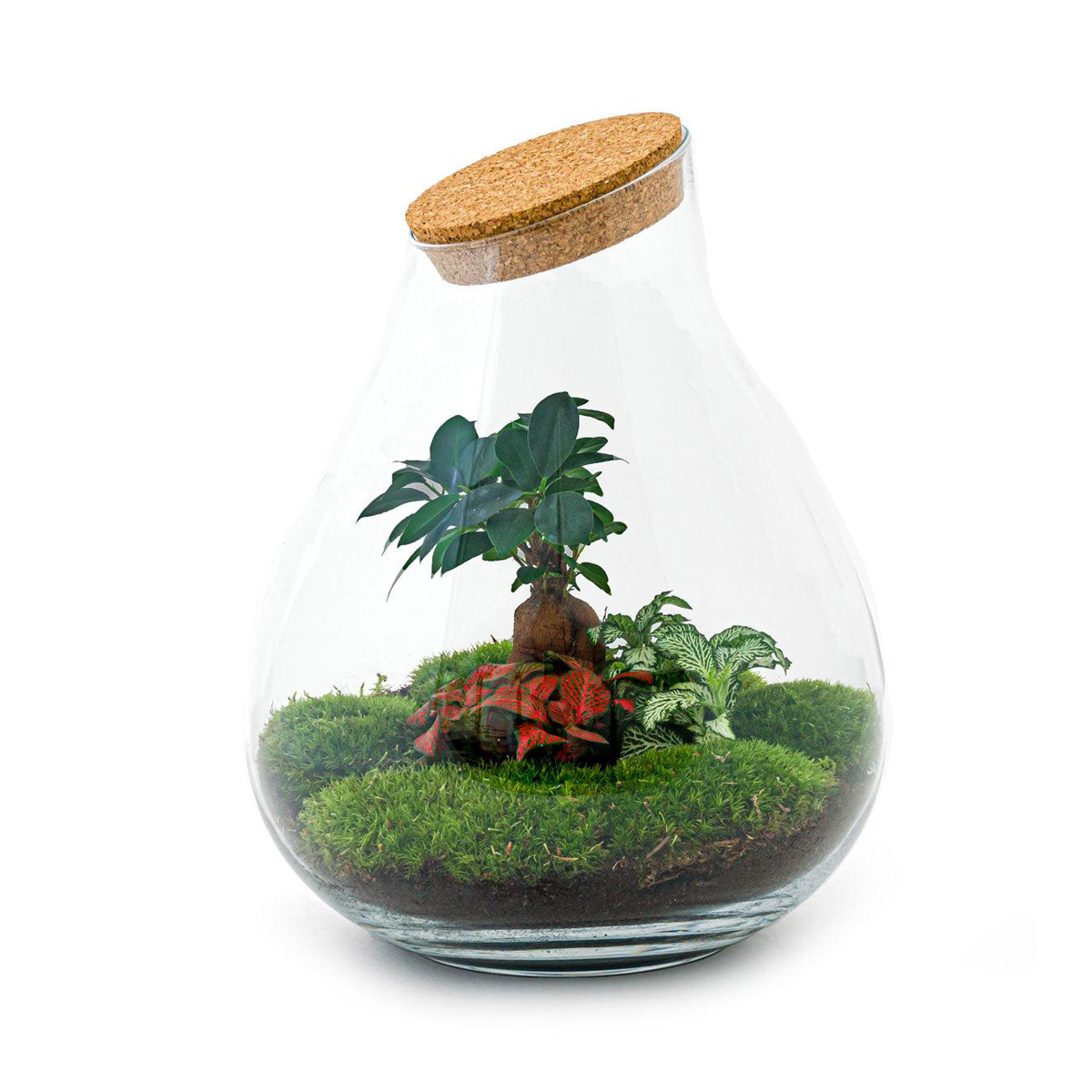 Het Planten Terrarium – Druppel XL Bonsai is een DIY-pakket waarmee je in 10 minuten een zelfvoorzienend ecosysteem creëert. Inclusief bonsai, Fittonia rood en wit, mossen en alle materialen om direct aan de slag te gaan.