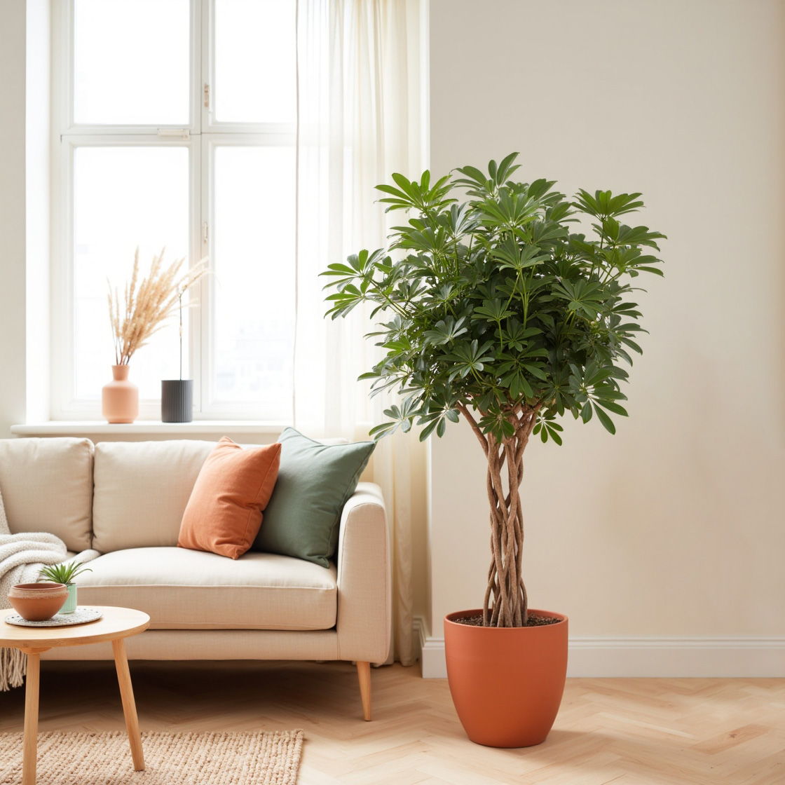 Schefflera Arboricola Compacta met gevlochten stam is een bijzondere kamerplant die direct sfeer en elegantie toevoegt aan je interieur. Dankzij de volle, glanzende bladeren en de unieke gevlochten stam is deze plant een echte blikvanger in huis of op kantoor.